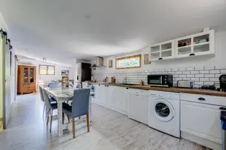 Une cuisine équipée avec frigo, four, micro onde, lave vaisselle, cafetière et une machine à café l’or (capsule métallique), bouilloire, grille pain, un lave linge.