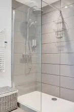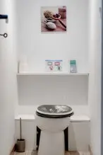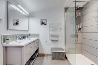 Une salle de bain avec douche, lavabo double vasque. WC séparé.
