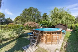 A l’extérieur, un jardin de 700m², entièrement clôturé et sans vis-à-vis, avec une piscine hors sol de 5x3.5x1.30, des transats, un coin repas sous les arbres avec son barbecue, une table de pingpong ainsi que des boules de pétanque.