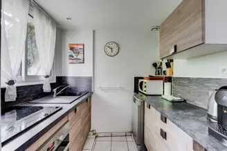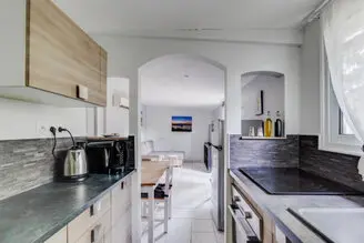 Une cuisine équipée avec frigo, four, micro onde, lave vaisselle, cafetière et une machine à café l’or (capsule métallique), bouilloire, grille pain.
