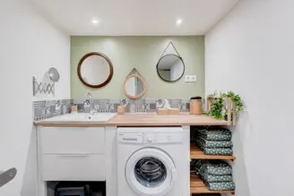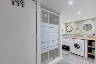 Une salle de bain avec douche, lavabo et lave linge. WC séparé.
