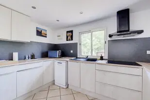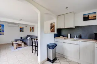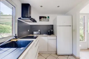 Une cuisine équipée avec frigo, micro onde, lave vaisselle, cafetière et une machine à café l’or (capsule métallique), bouilloire, grille pain. Une machine à laver est aussi à votre usage privé.